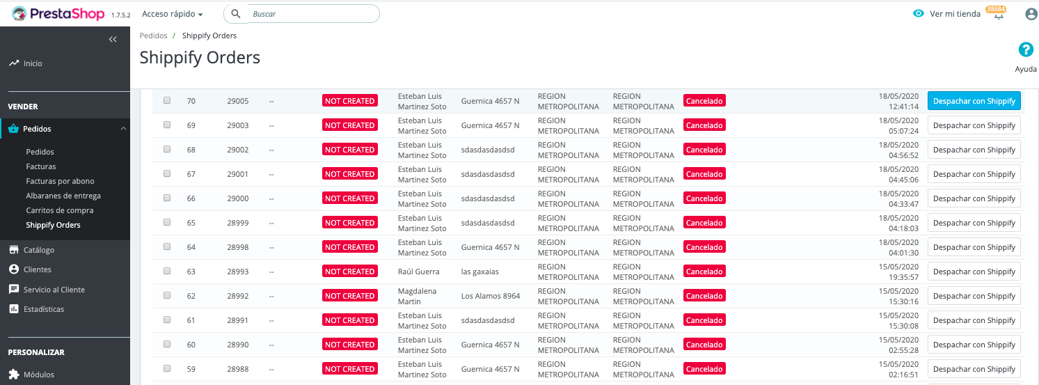 In this section, you can view orders for the configured zone and identify those that have been created and those that have not been created in our system. You can select those that have not been created and send them to Shippify for dispatch.
