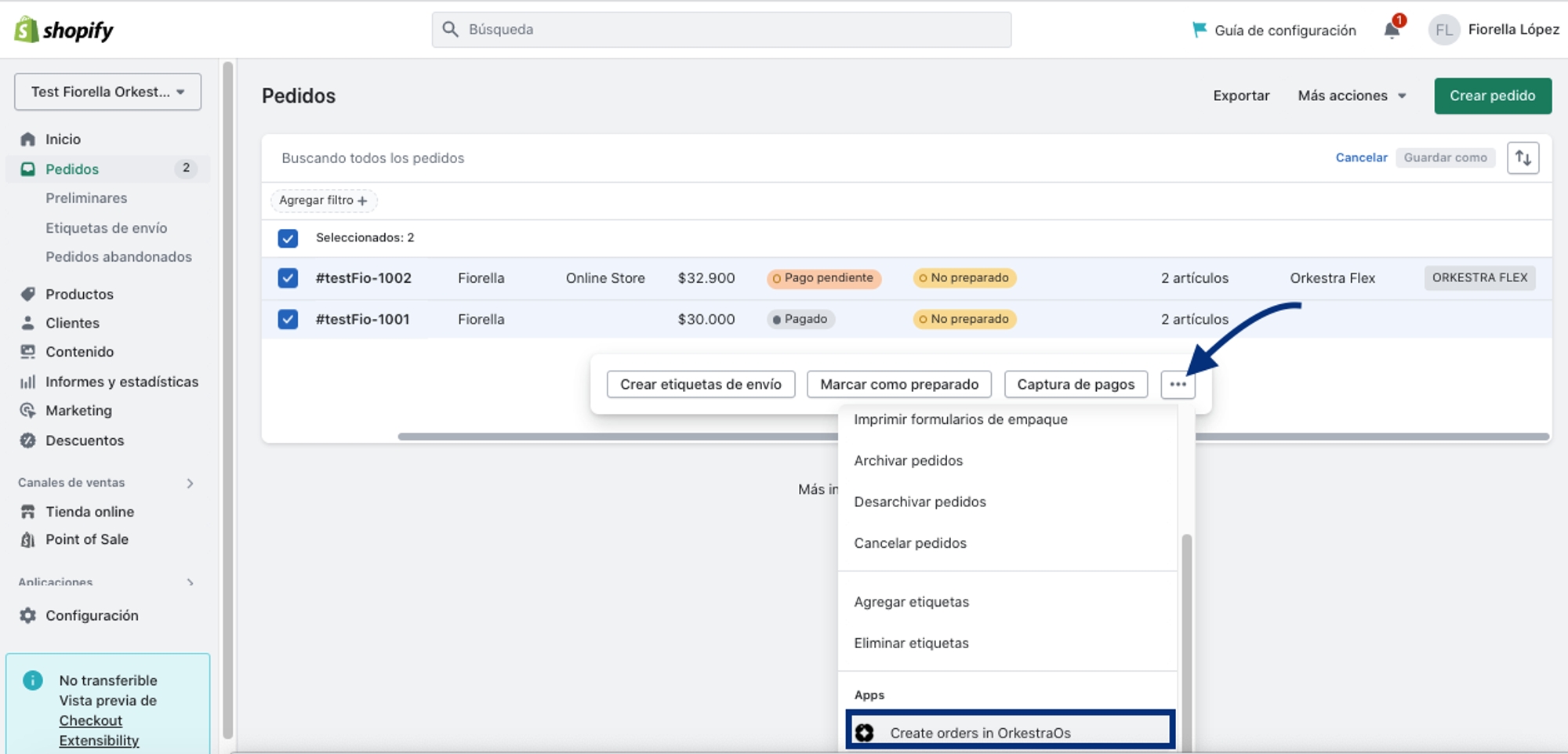 Pedidos > Selecionar os pedidos pendentes ["Não preparado"] > Clicar nos 3 pontinhos na parte inferior > Selecionar “Create orders in OrkestraOS”