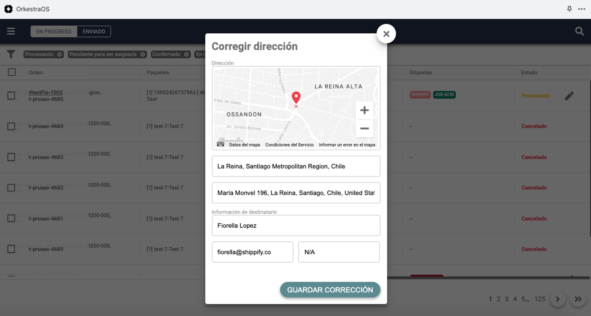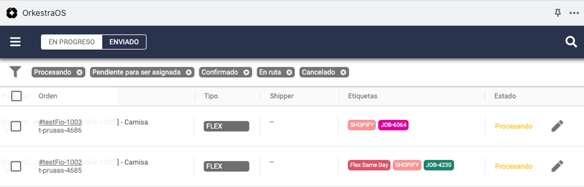 Depois de concluir o processo de criação, você poderá ver suas entregas criadas no Shippify com o status de "Processing" ou "Processando". Se o endereço não pôde ser encontrado, elas serão criadas com o status "Pending to review" ou "Pendente de revisão", então você deverá corrigi-las imediatamente, clicando no ícone de lápis.