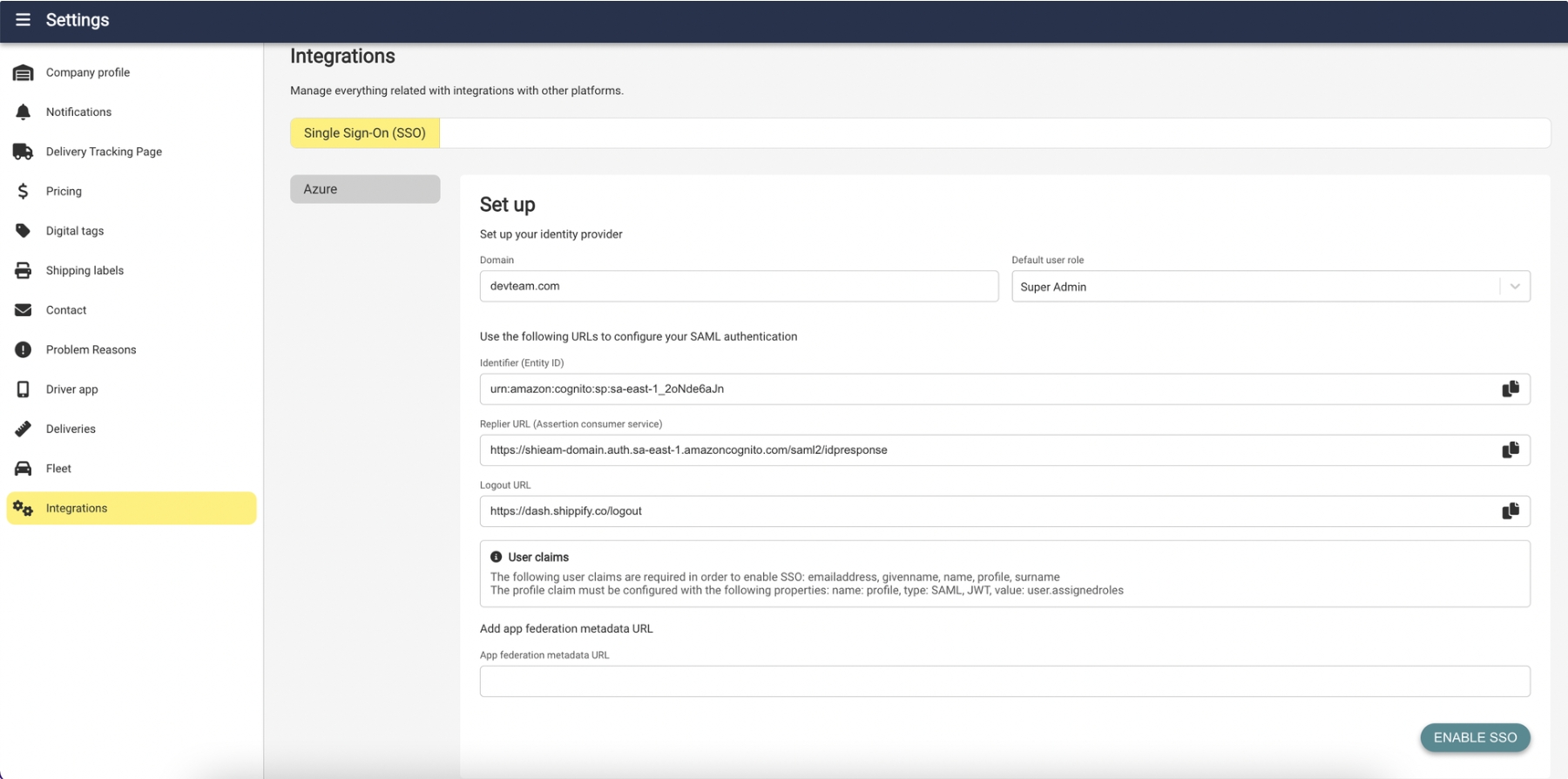 . A partir da página de configuração de SSO do seu IdP, copie a URL de metadados para a página de configuração do Shippify e clique em "Habilitar SSO" para completar a configuração.
